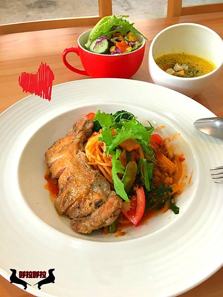 泰式打拋嫩雞義大利麵+優惠組合(附濃湯、沙拉、香蒜麵包)