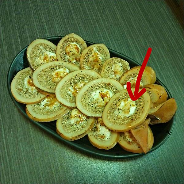 經過煙燻的帶子小卷切片下去,再用美乃滋在上面點綴,最後火烤逼出香味。